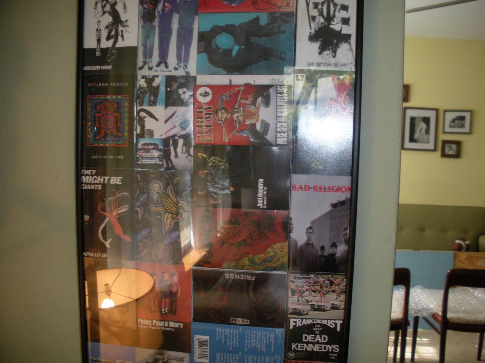 These blooming record sculptures are made from old albums, melted and then painted in the center. The stems are metal candle sticks. Buttons and telephone wire connect the flowers to the stems.